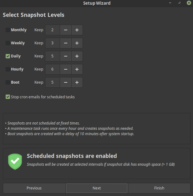 Jeg vil ikke gå i detaljer med hvordan dette sættes op - men jeg kan dog oplyse at jeg benytter Linux Mint's egne præfecenser hvad angår backup. Så derfor laver jeg snapshots på daglig basis, og gemmer dernæst 5 stk.