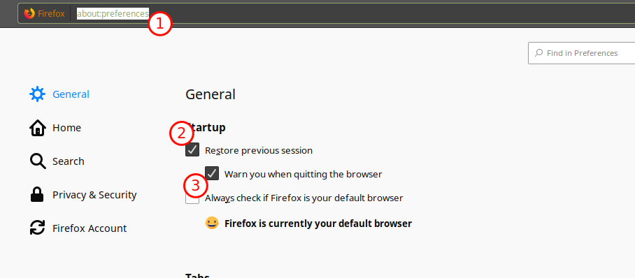 Skulle du ved en fejl komme til at lukke alt, og virker gendannelsen ikke efter hensigten, kan du åbne stien ~/.mozilla/firefox/dormvqxr.default/sessionstore-backups. previous.jsonlz4 burde være de sidste adresser som du har besøgt. Du kan fx. denne side trække URL'erne ud af filen. Firefox har desuden en god sektion til fejlfinding. Den kan du tilgå ved at gå til siden about:support, hvor der desudne også er en genvej til den sti, hvis du kigger under punktet "Profile Directory".